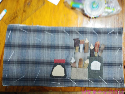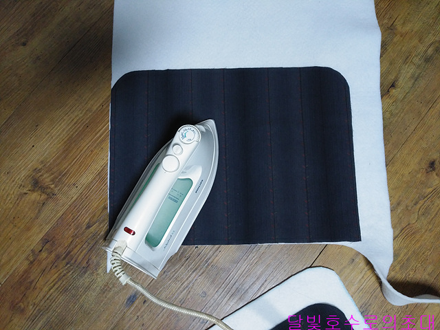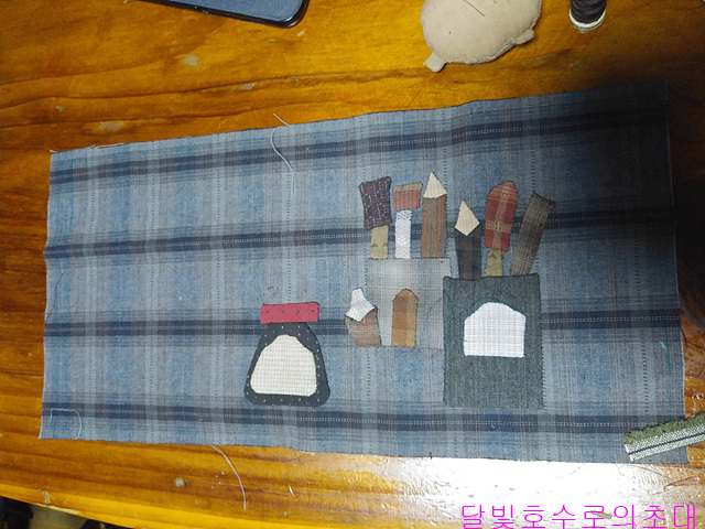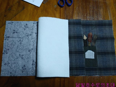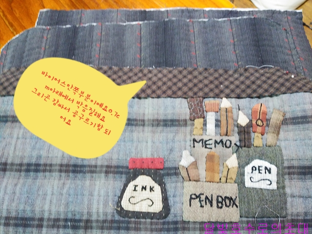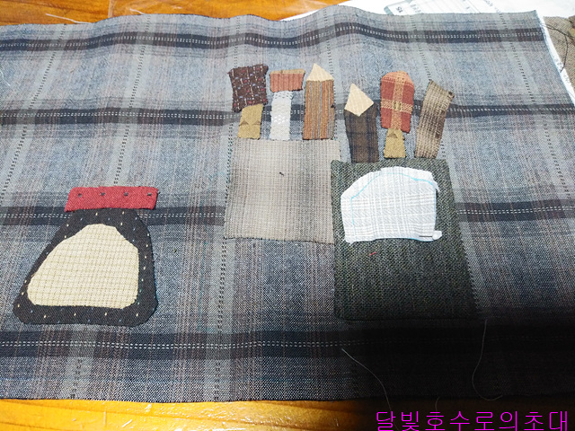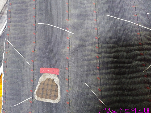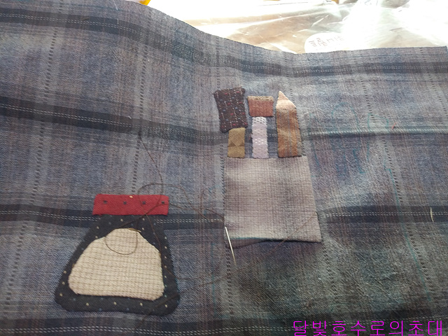 앞주머니라도 사진처럼 안감(안)/솜/겉감(겉)을 대고 시침한 후 아플리케 모양 따라 시침한다